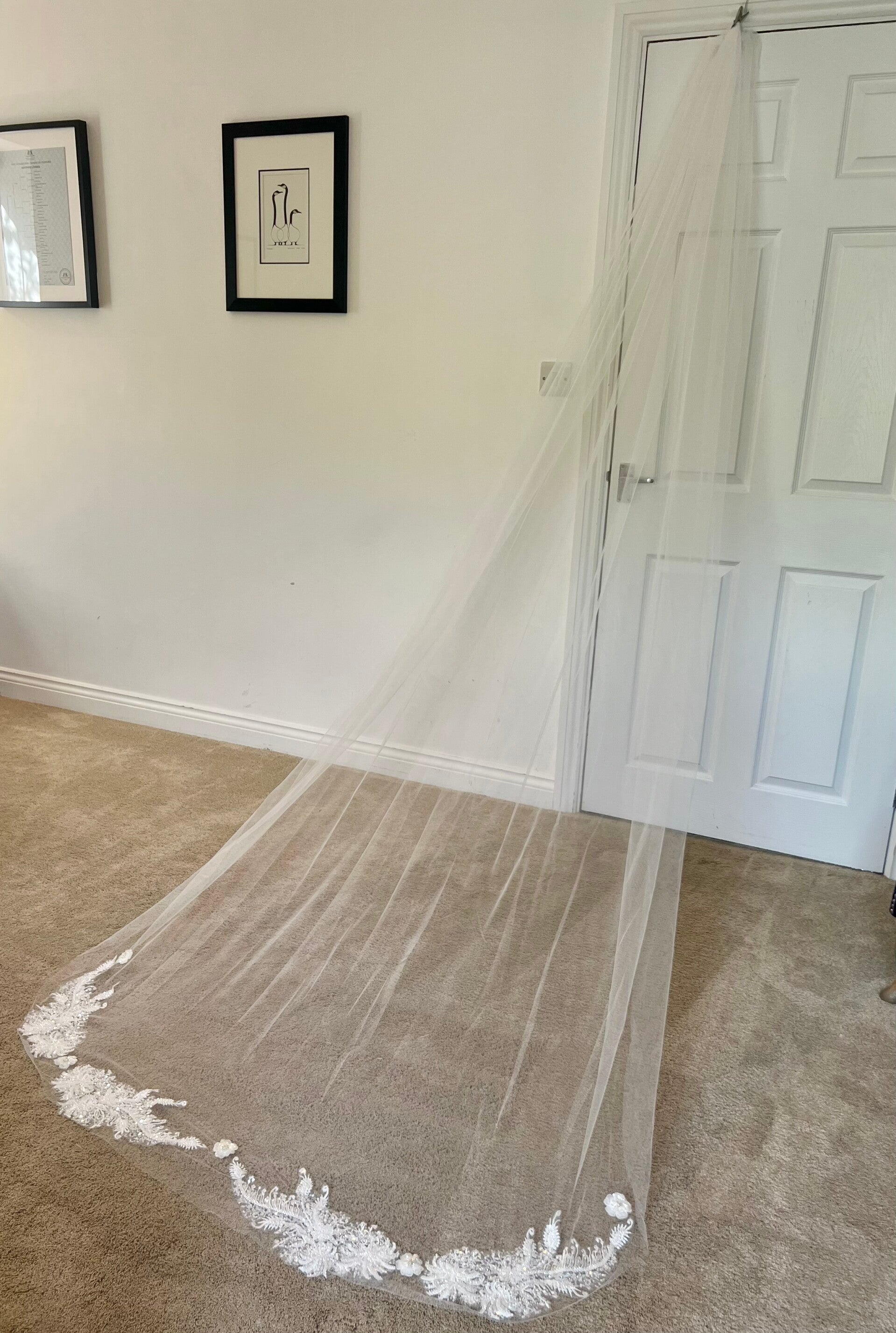 Elevate your bridal gown in this stunning glass bead floral veil, elegantly finished. At 300cm in length with beaded floral appliqués hand sewn into the edging of the veil this adds a show stopping finish to your bridal look.